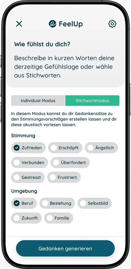 Tippe nur ein paar Wörter zu deinem aktuellen Gefühl oder Thema. FeelUp erkennt den Kontext und erstellt präzise Formulierungen, die dich Schritt für Schritt in eine bessere Richtung führen – wahlweise in der „Ich“- oder „Du“-Ansprache.